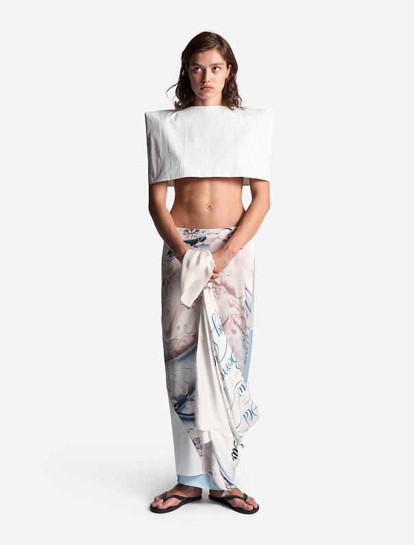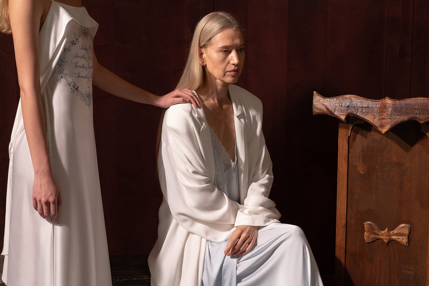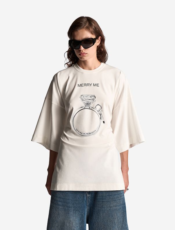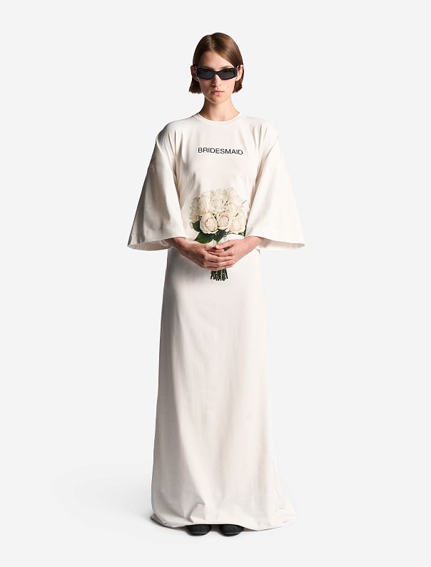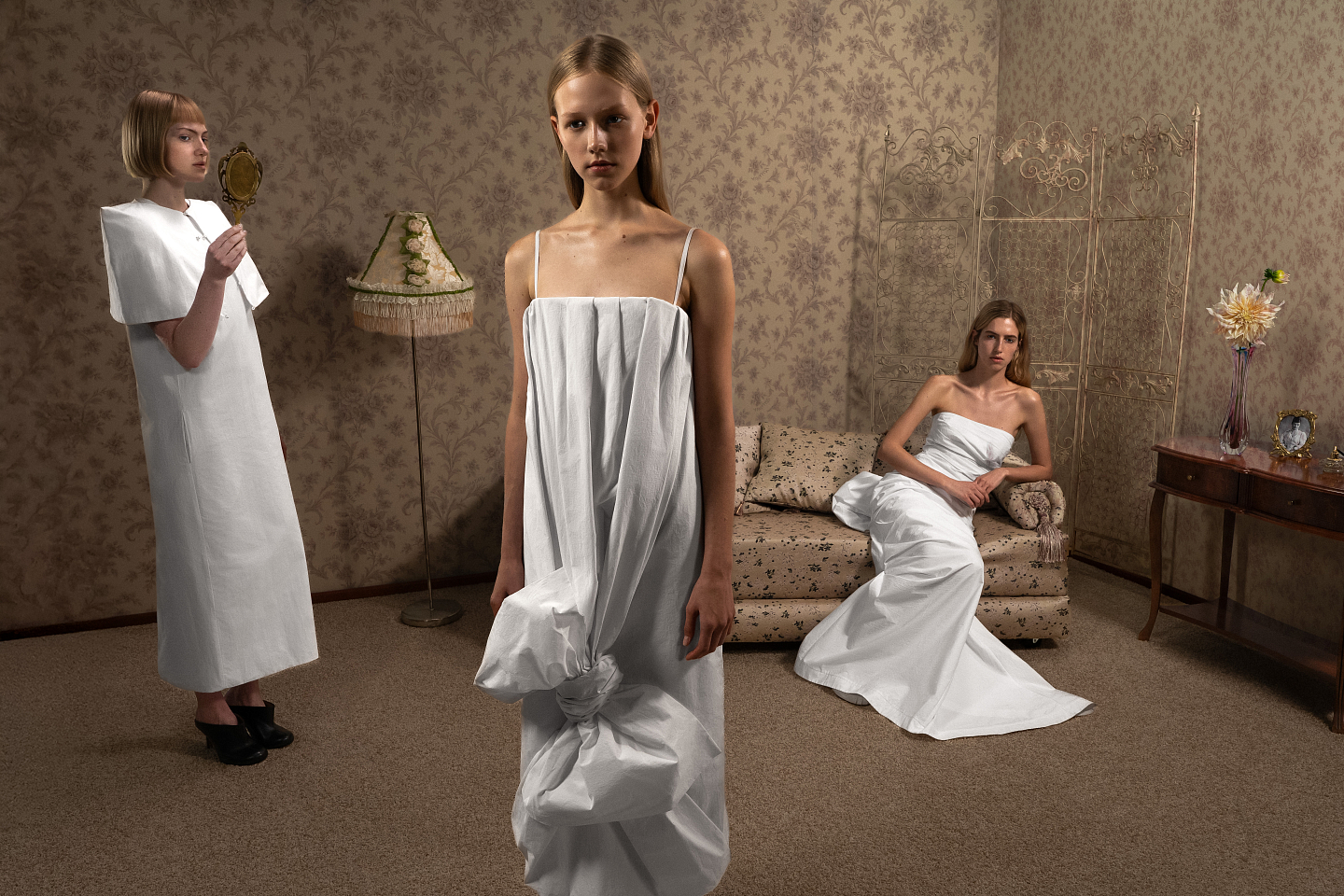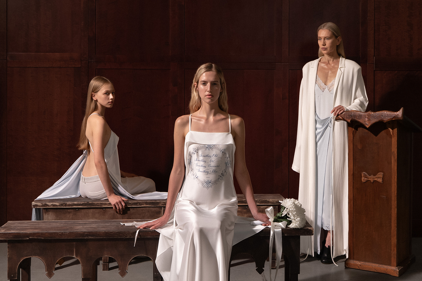 Так, место «чего-то старого» заняли силуэты, ставшие классикой Ushatava: комбинации из жатого жемчужного сатина, платье-кейп со съемными подплечниками, летящий топ-полотно и «песочные часы». Без этих моделей мы не можем представить ни одну свадебную коллекцию Ushatava. За «что-то новое» отвечают изделия, которые встречаются впервые, — среди них: платье на крючках, коллажная юбка со шлейфом и кокетка Sharp Shoulders. Вещь, взятая взаймы, в интерпретации модного Дома — это свадебные штампы, перевернутые с ног на голову. Помолвочное кольцо разрастается до размеров принта, а игра букв в вопросе “Marry Me?” меняет смысл фразы. В переводе с английского “Merry Me” означает «развесели меня» — и становится шутливым призывом для всех, кто встретит вас в футболке с этой надписью. Шаблоны наследуются и в гипертрофированных деталях кроя — например, платье с защипами на юбке напоминает кремовые ярусы свадебного торта. Последний символ — «что-то голубое» — мы истолковали буквально. Это единственный хроматический цвет коллекции — а дополняют его черный и белый, традиционно присущие жениху с невестой.