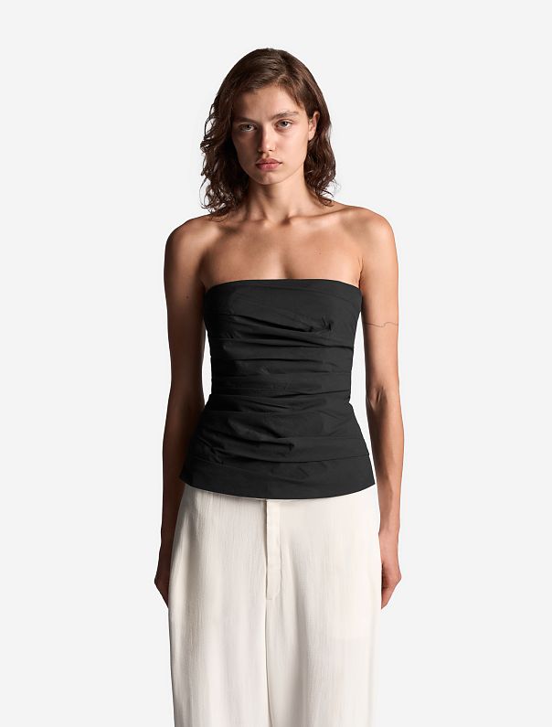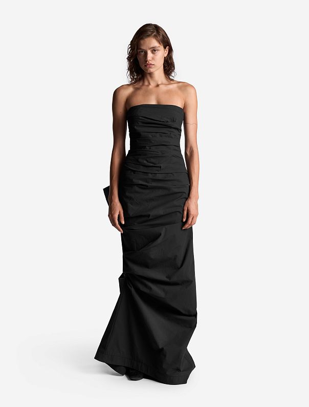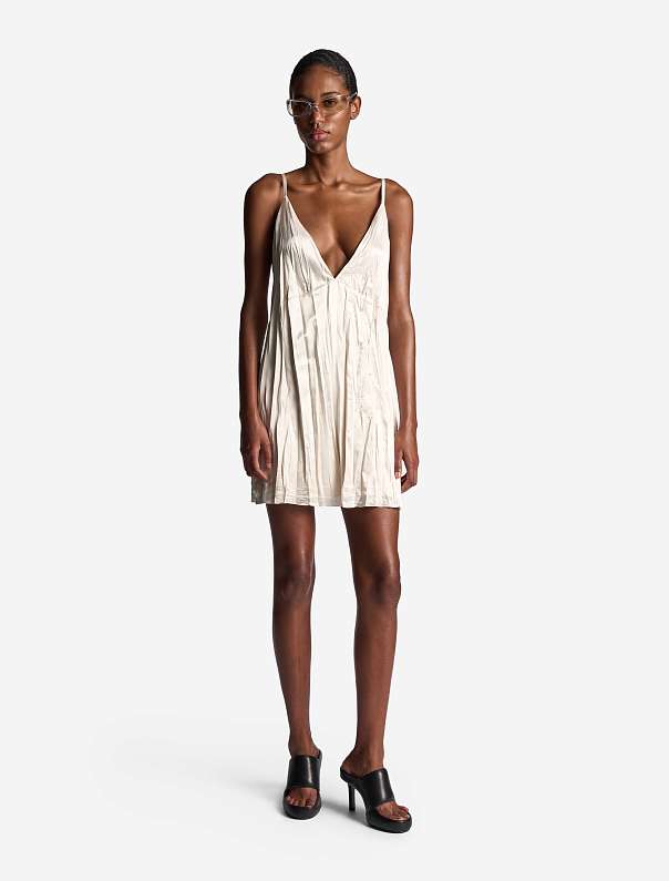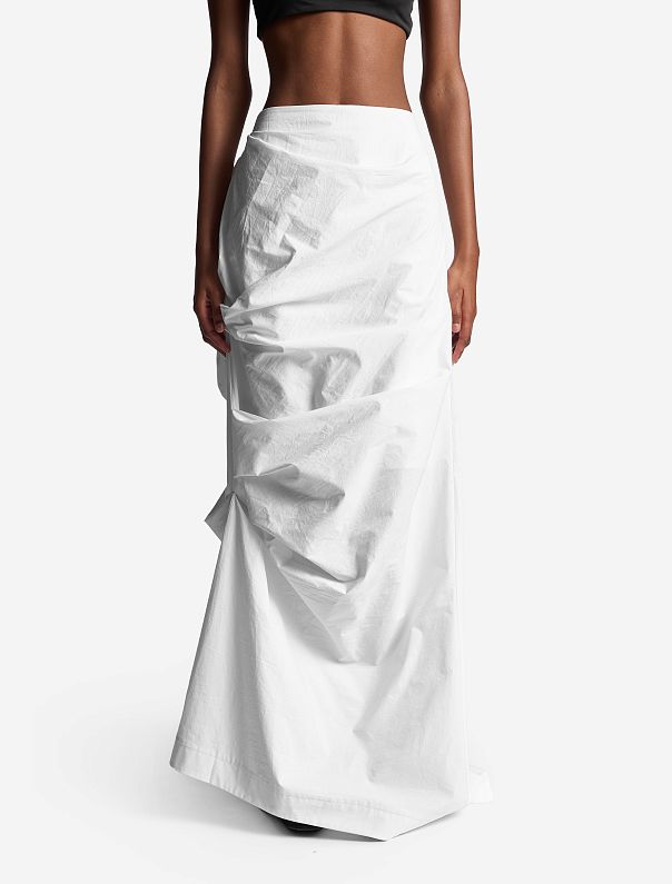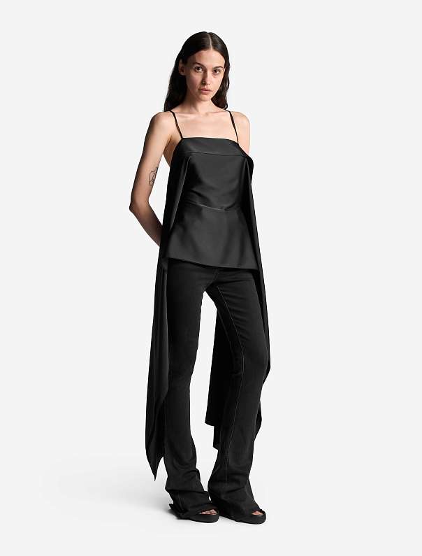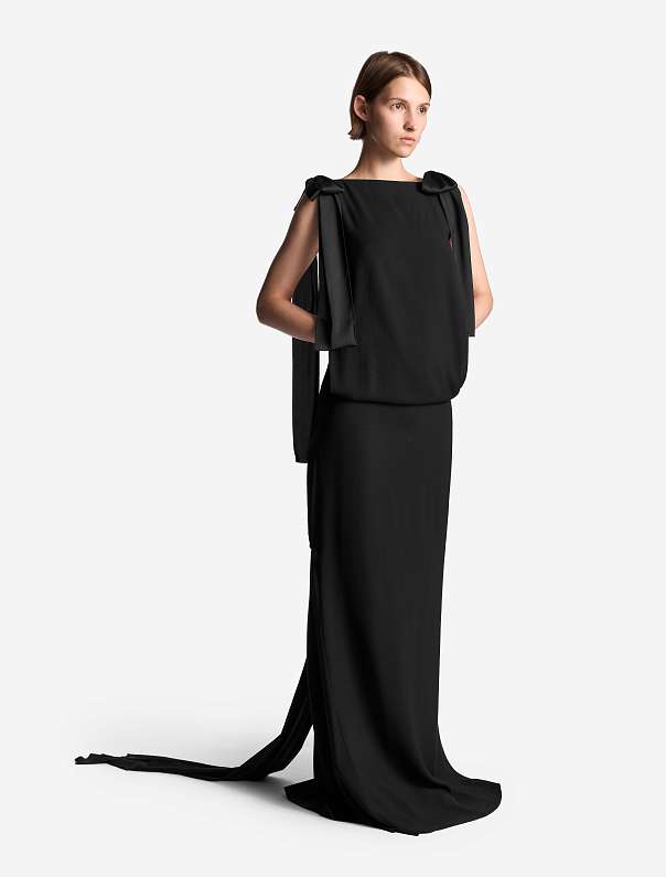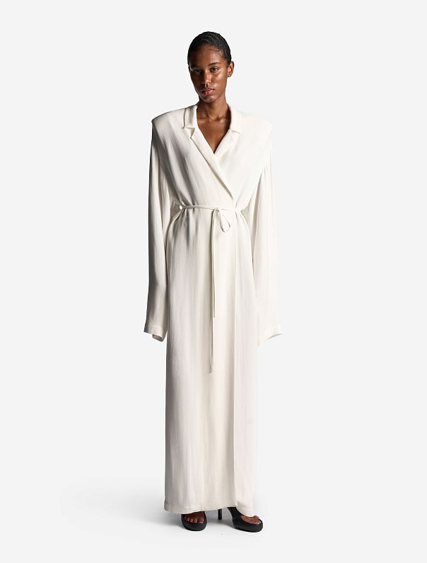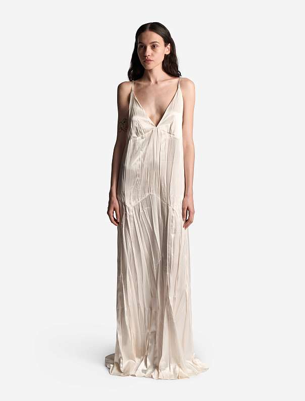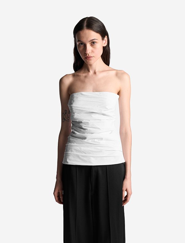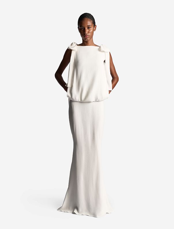 Так, место «чего-то старого» заняли силуэты, ставшие классикой Ushatava: комбинации из жатого жемчужного сатина, платье-кейп со съемными подплечниками, летящий топ-полотно и «песочные часы». Без этих моделей мы не можем представить ни одну свадебную коллекцию Ushatava. За «что-то новое» отвечают изделия, которые встречаются впервые, — среди них: платье на крючках, коллажная юбка со шлейфом и кокетка Sharp Shoulders. Вещь, взятая взаймы, в интерпретации модного Дома — это свадебные штампы, перевернутые с ног на голову. Помолвочное кольцо разрастается до размеров принта, а игра букв в вопросе “Marry Me?” меняет смысл фразы. В переводе с английского “Merry Me” означает «развесели меня» — и становится шутливым призывом для всех, кто встретит вас в футболке с этой надписью. Шаблоны наследуются и в гипертрофированных деталях кроя — например, платье с защипами на юбке напоминает кремовые ярусы свадебного торта. Последний символ — «что-то голубое» — мы истолковали буквально. Это единственный хроматический цвет коллекции — а дополняют его черный и белый, традиционно присущие жениху с невестой.