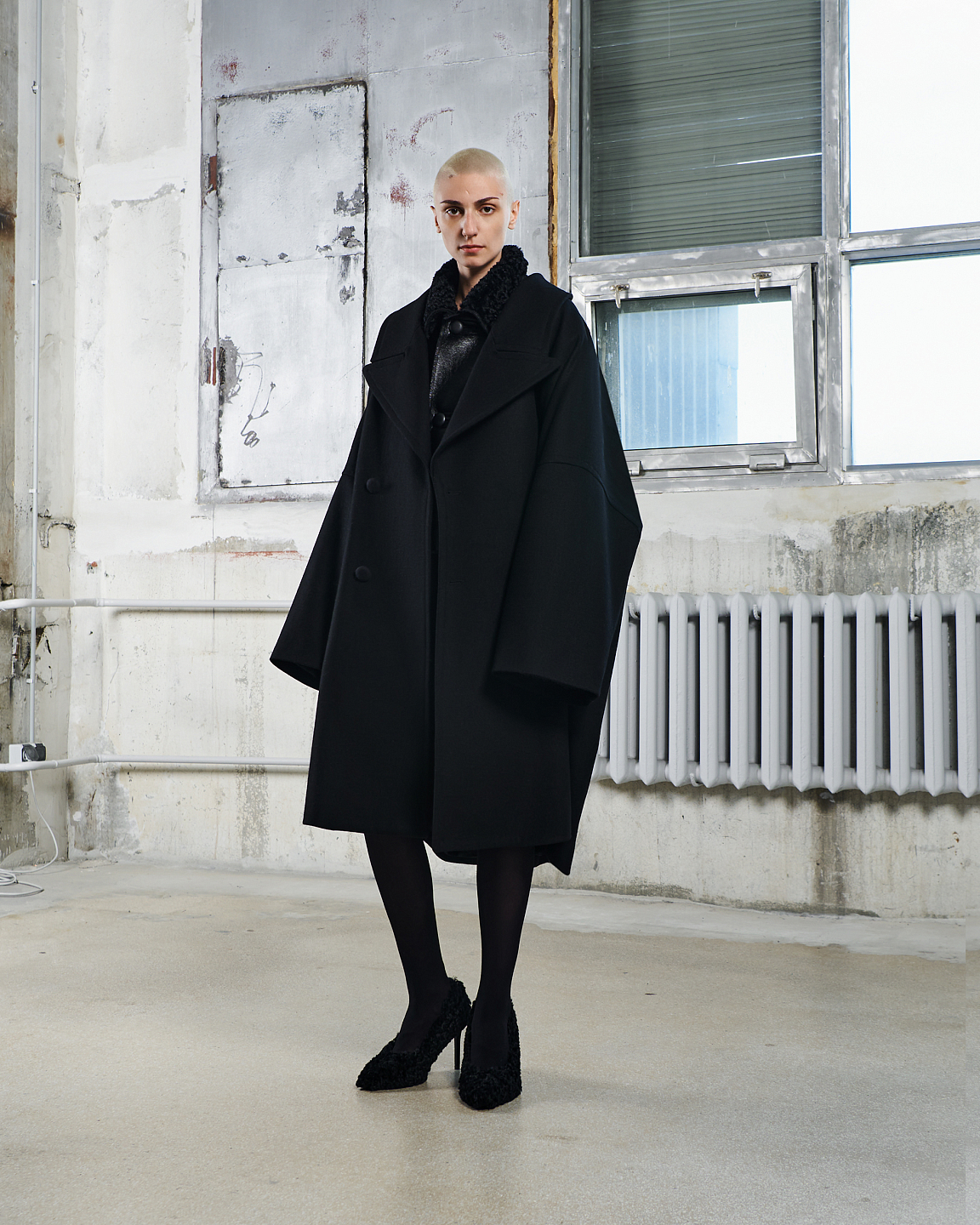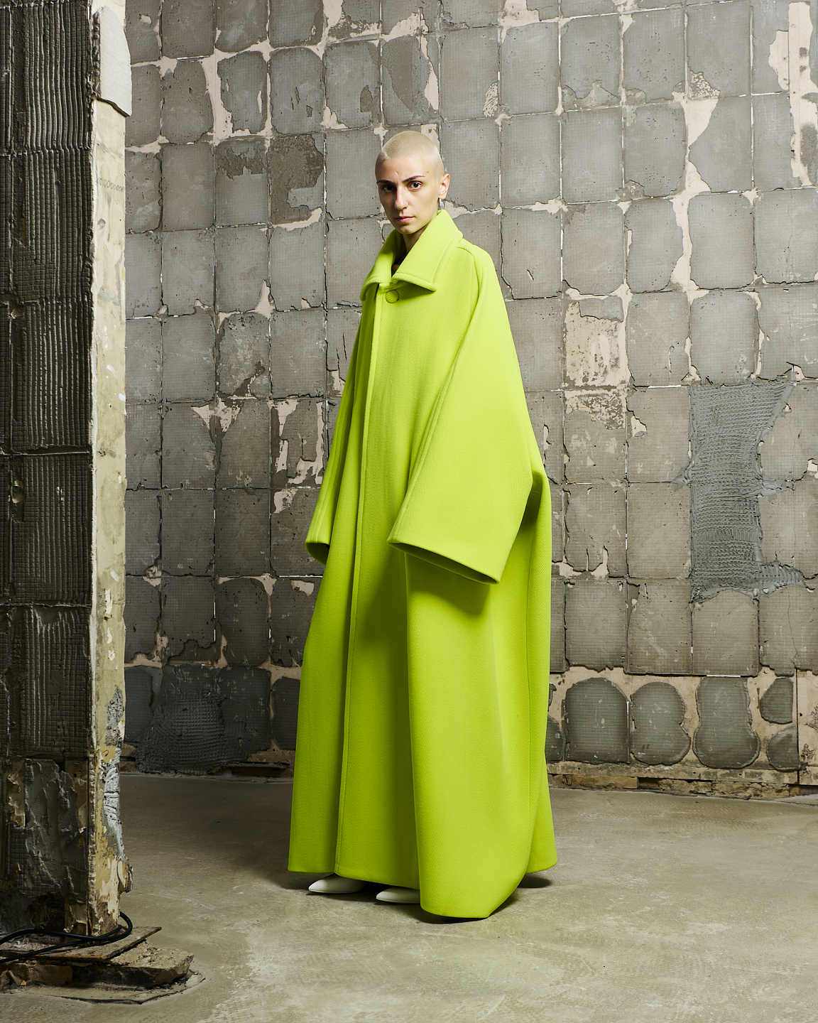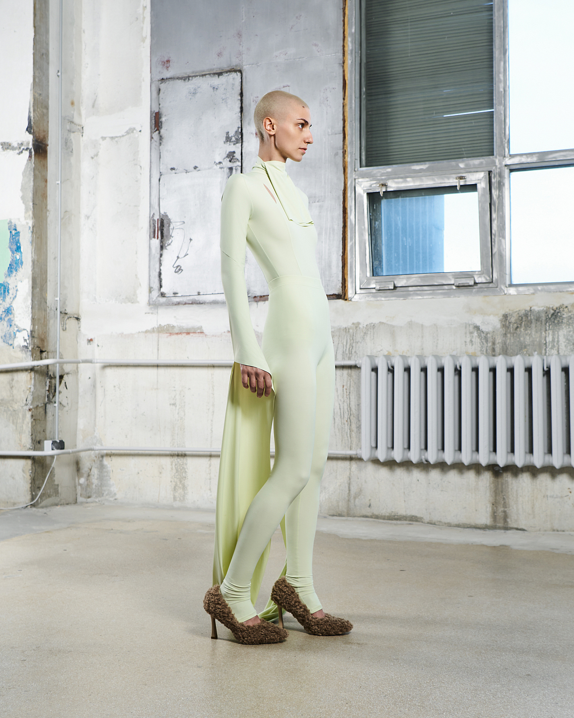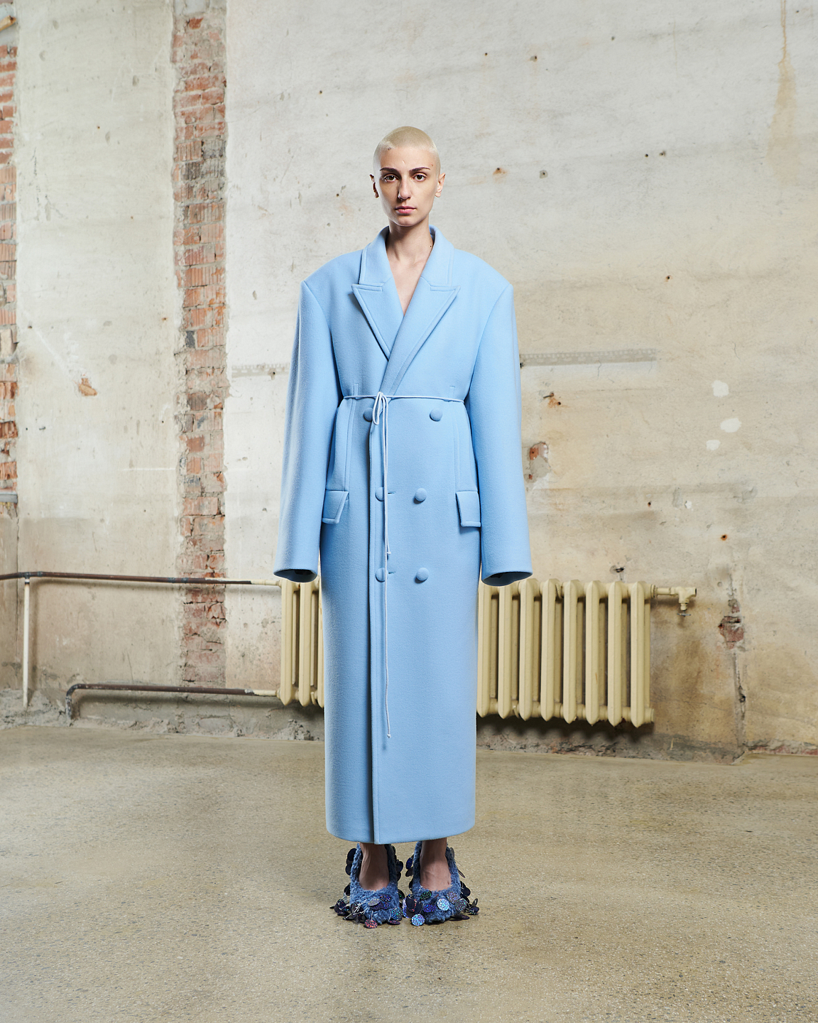Такой борьбы, в результате которой Нино выбирала себя, свои интересы и свою свободу, в ее жизни было много. Воспоминания нанизывались на нить — коллекция рождалась на глазах. Нино думала о своей консервативной грузинской семье с ярко выраженным патриархальным укладом, которая предопределила ее экономическое образование — и о том, как после окончания университета она все же решилась уйти в «несерьёзную» моду. В Color.Block эту историю иллюстрирует двухсторонняя дубленка в пол. Она монументальная и маскулинная, но окрашена в небесно-голубой, который сбивает с предмета градус серьезности. Эта дубленка названа в честь Нино. Приставка «грузинский» появилась в рабочем названии и другого изделия — платья Rondo из лайкры. Его закольцованный крой вдохновлен откидным рукавом традиционного костюма грузинских женщин. Обращение к этому выразительному элементу продиктовано сразу двумя важными для Color.Block темами: танцем (потому что сегодня в таком костюме в основном танцуют) и рефлексией Нино на тему своих корней.