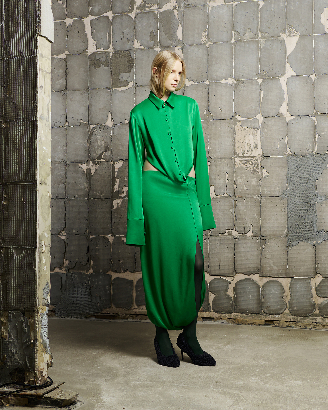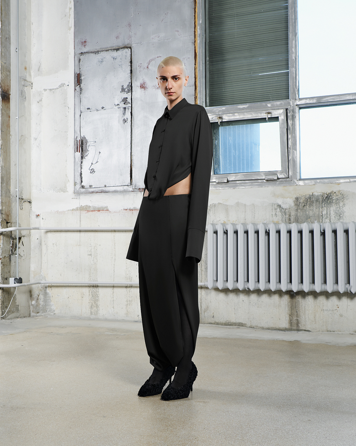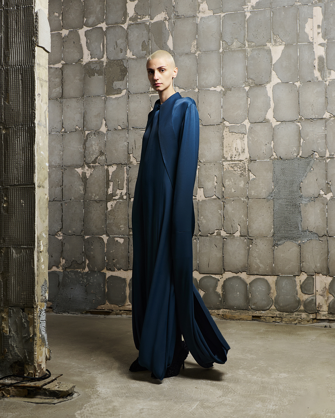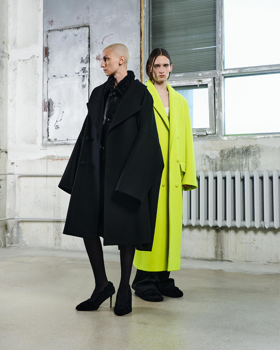 Такой борьбы, в результате которой Нино выбирала себя, свои интересы и свою свободу, в ее жизни было много. Воспоминания нанизывались на нить — коллекция рождалась на глазах. Нино думала о своей консервативной грузинской семье с ярко выраженным патриархальным укладом, которая предопределила ее экономическое образование — и о том, как после окончания университета она все же решилась уйти в «несерьёзную» моду. В Color.Block эту историю иллюстрирует двухсторонняя дубленка в пол. Она монументальная и маскулинная, но окрашена в небесно-голубой, который сбивает с предмета градус серьезности. Эта дубленка названа в честь Нино. Приставка «грузинский» появилась в рабочем названии и другого изделия — платья Rondo из лайкры. Его закольцованный крой вдохновлен откидным рукавом традиционного костюма грузинских женщин. Обращение к этому выразительному элементу продиктовано сразу двумя важными для Color.Block темами: танцем (потому что сегодня в таком костюме в основном танцуют) и рефлексией Нино на тему своих корней.