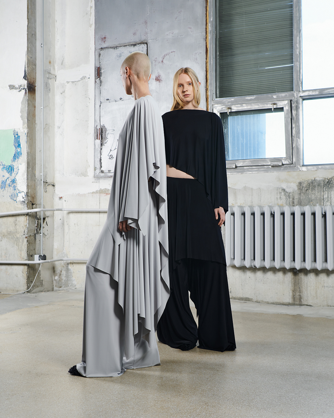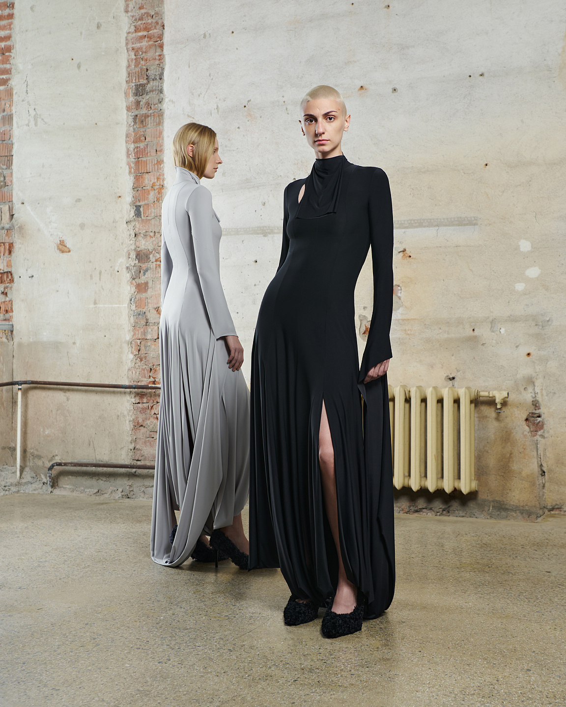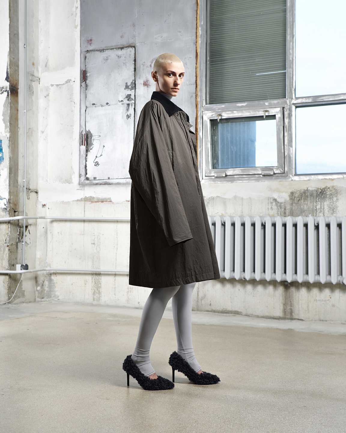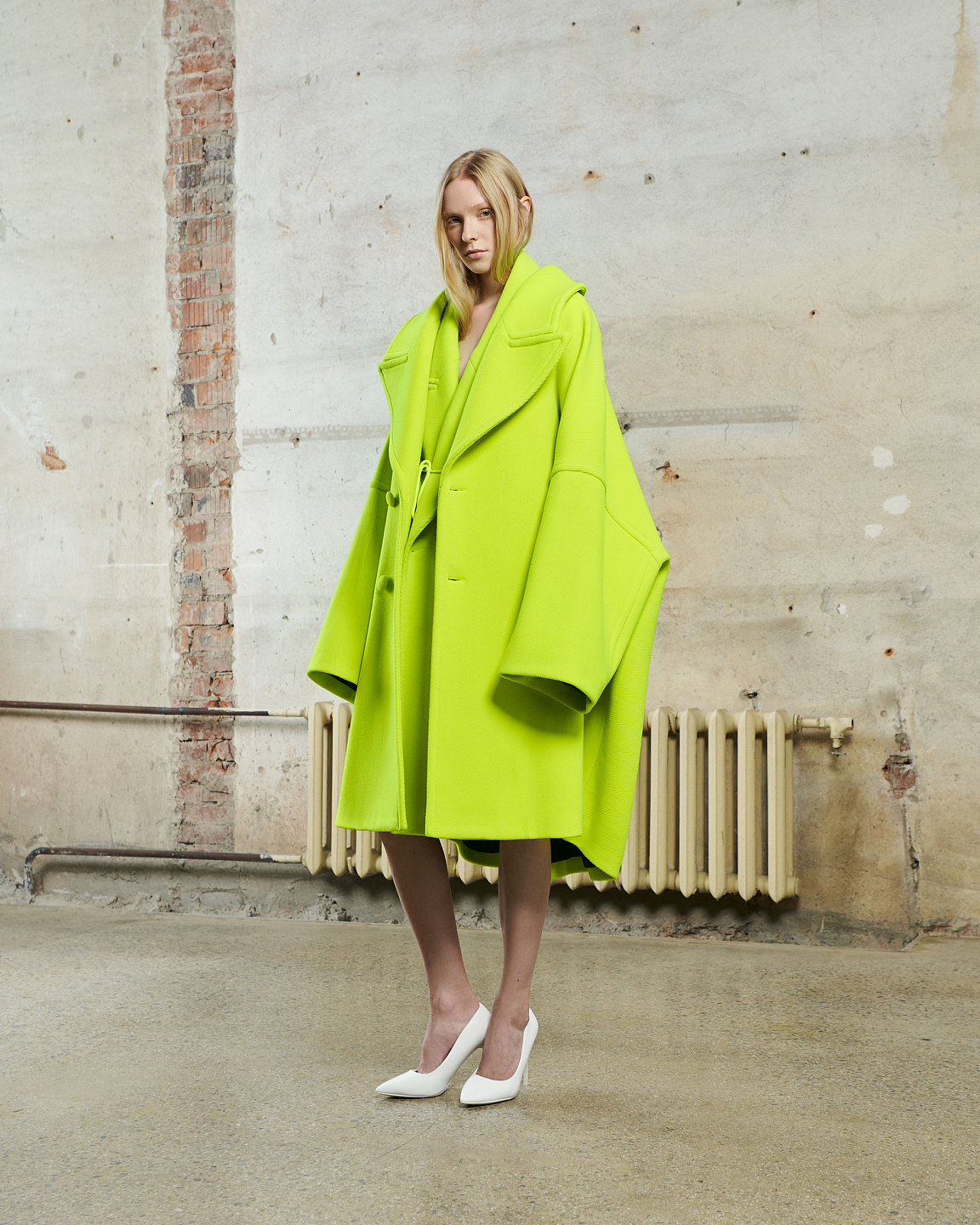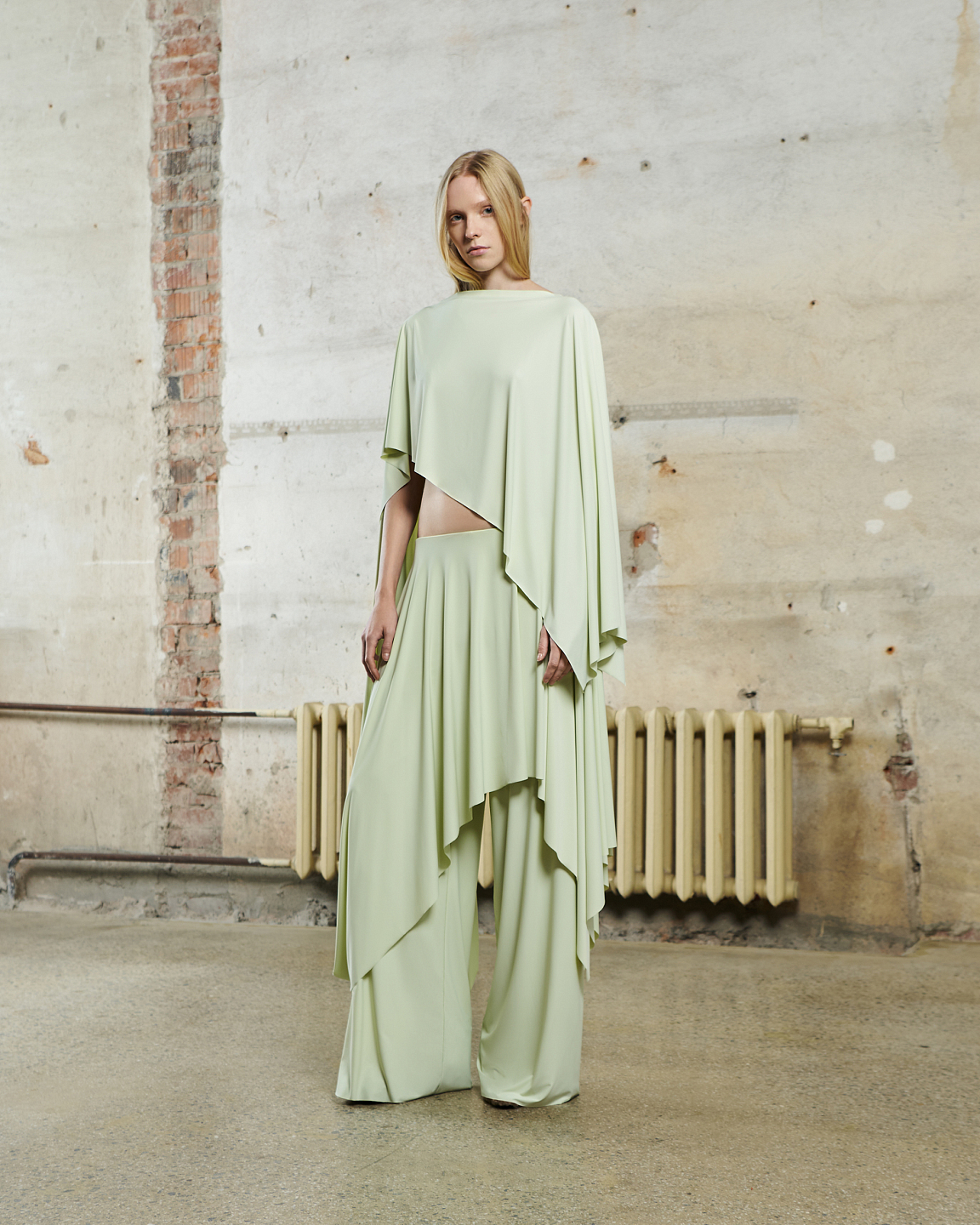 Такой борьбы, в результате которой Нино выбирала себя, свои интересы и свою свободу, в ее жизни было много. Воспоминания нанизывались на нить — коллекция рождалась на глазах. Нино думала о своей консервативной грузинской семье с ярко выраженным патриархальным укладом, которая предопределила ее экономическое образование — и о том, как после окончания университета она все же решилась уйти в «несерьёзную» моду. В Color.Block эту историю иллюстрирует двухсторонняя дубленка в пол. Она монументальная и маскулинная, но окрашена в небесно-голубой, который сбивает с предмета градус серьезности. Эта дубленка названа в честь Нино. Приставка «грузинский» появилась в рабочем названии и другого изделия — платья Rondo из лайкры. Его закольцованный крой вдохновлен откидным рукавом традиционного костюма грузинских женщин. Обращение к этому выразительному элементу продиктовано сразу двумя важными для Color.Block темами: танцем (потому что сегодня в таком костюме в основном танцуют) и рефлексией Нино на тему своих корней.