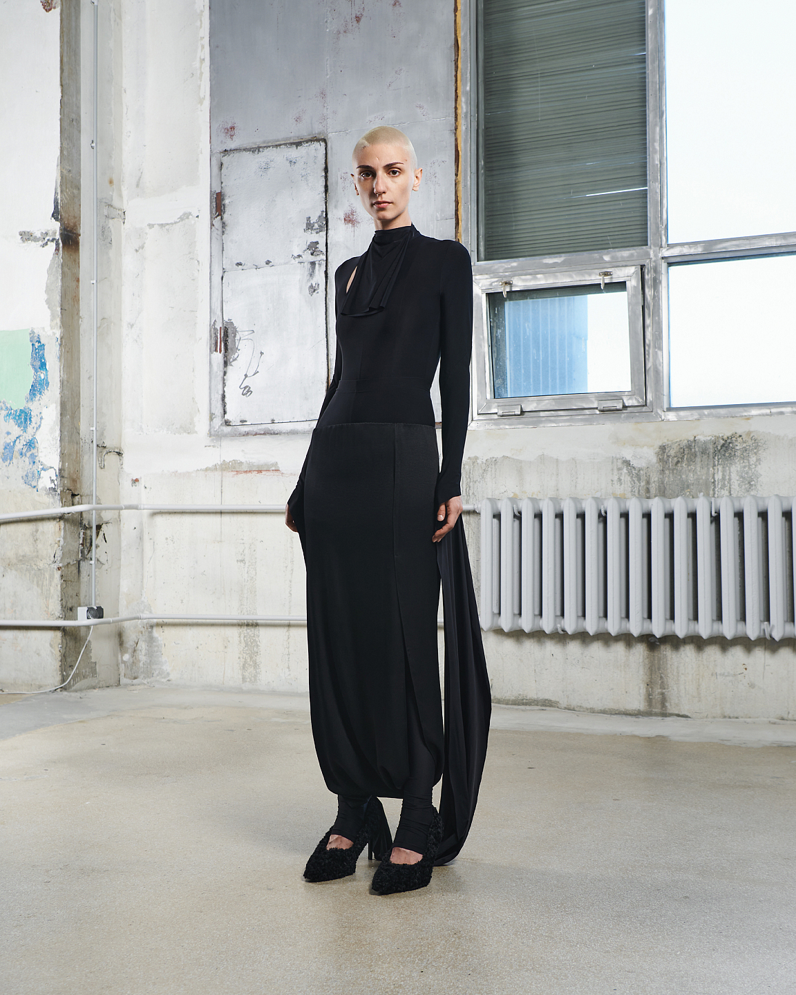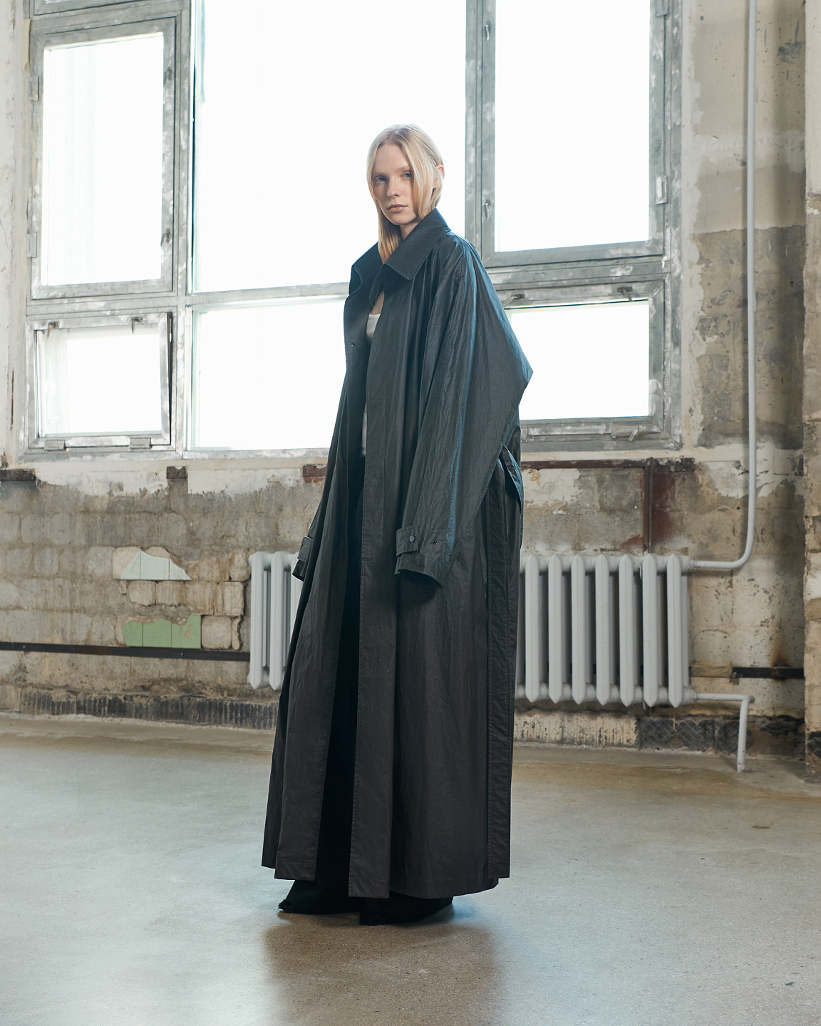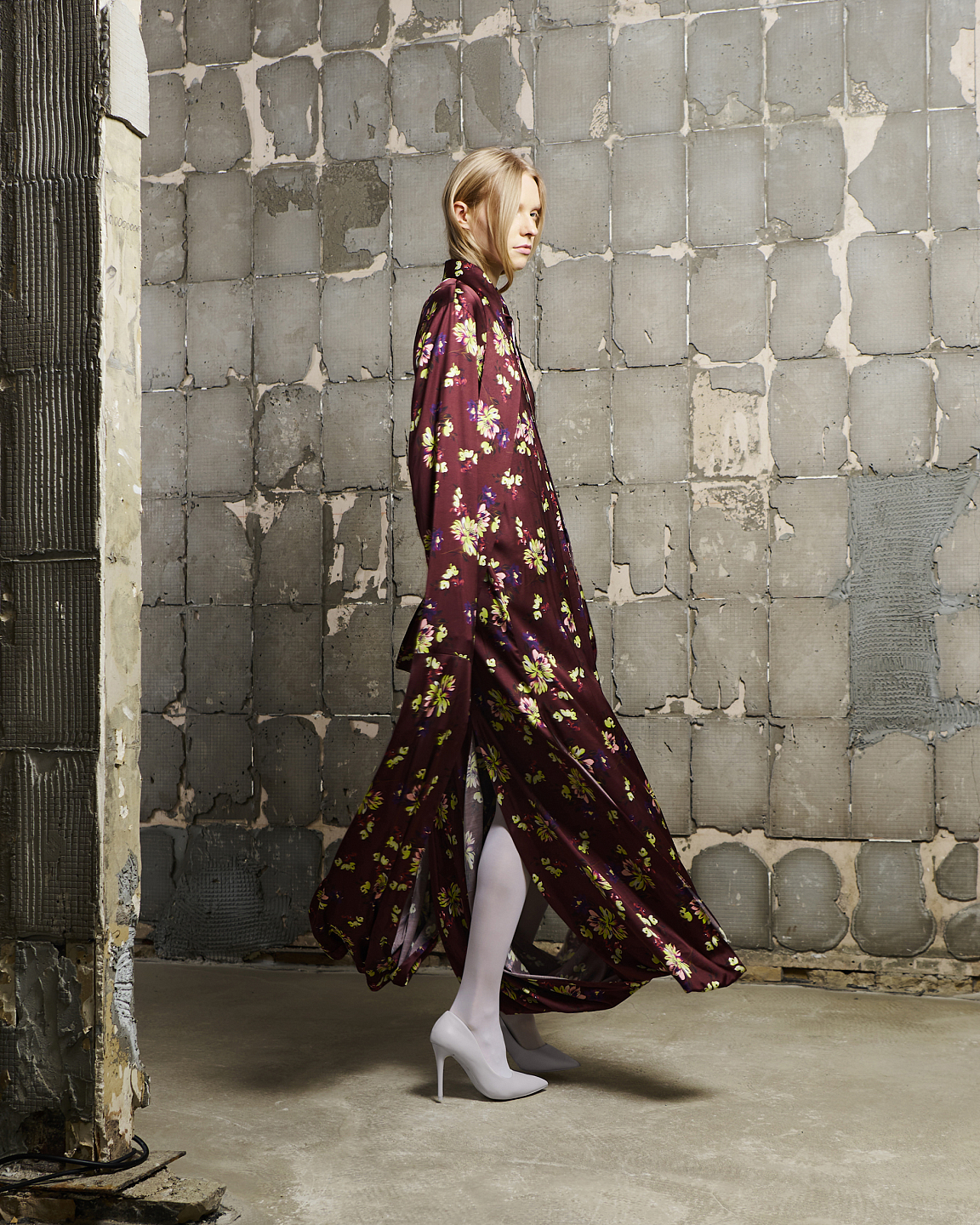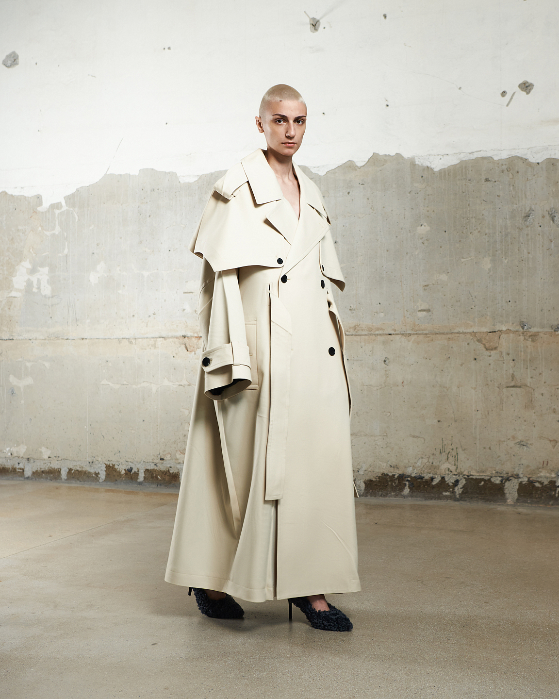 Такой борьбы, в результате которой Нино выбирала себя, свои интересы и свою свободу, в ее жизни было много. Воспоминания нанизывались на нить — коллекция рождалась на глазах. Нино думала о своей консервативной грузинской семье с ярко выраженным патриархальным укладом, которая предопределила ее экономическое образование — и о том, как после окончания университета она все же решилась уйти в «несерьёзную» моду. В Color.Block эту историю иллюстрирует двухсторонняя дубленка в пол. Она монументальная и маскулинная, но окрашена в небесно-голубой, который сбивает с предмета градус серьезности. Эта дубленка названа в честь Нино. Приставка «грузинский» появилась в рабочем названии и другого изделия — платья Rondo из лайкры. Его закольцованный крой вдохновлен откидным рукавом традиционного костюма грузинских женщин. Обращение к этому выразительному элементу продиктовано сразу двумя важными для Color.Block темами: танцем (потому что сегодня в таком костюме в основном танцуют) и рефлексией Нино на тему своих корней.