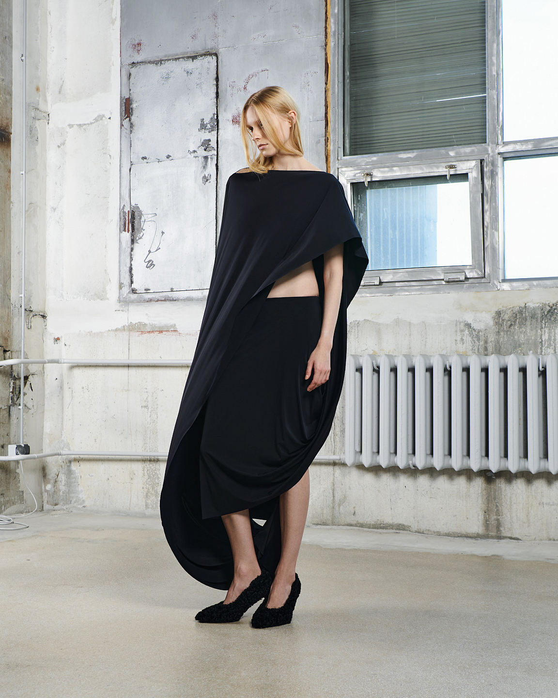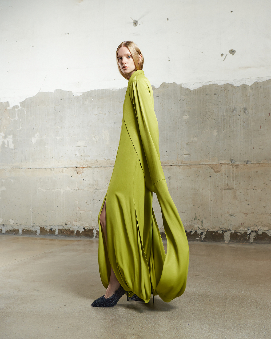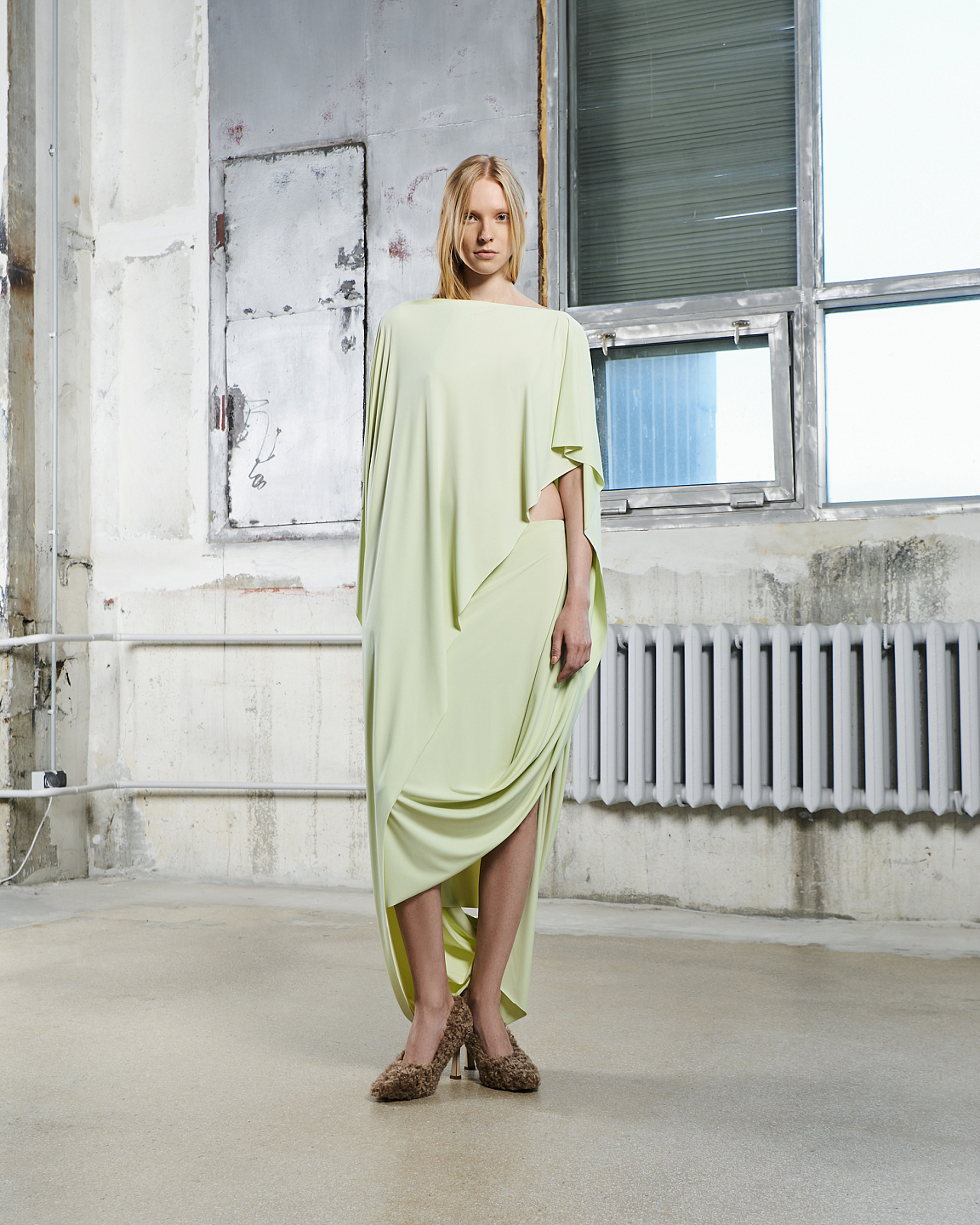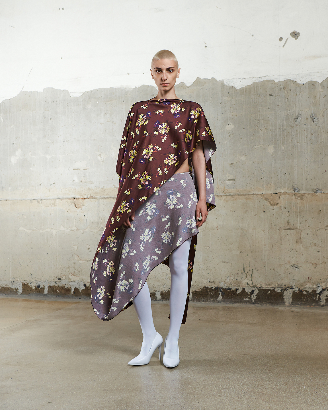 Такой борьбы, в результате которой Нино выбирала себя, свои интересы и свою свободу, в ее жизни было много. Воспоминания нанизывались на нить — коллекция рождалась на глазах. Нино думала о своей консервативной грузинской семье с ярко выраженным патриархальным укладом, которая предопределила ее экономическое образование — и о том, как после окончания университета она все же решилась уйти в «несерьёзную» моду. В Color.Block эту историю иллюстрирует двухсторонняя дубленка в пол. Она монументальная и маскулинная, но окрашена в небесно-голубой, который сбивает с предмета градус серьезности. Эта дубленка названа в честь Нино. Приставка «грузинский» появилась в рабочем названии и другого изделия — платья Rondo из лайкры. Его закольцованный крой вдохновлен откидным рукавом традиционного костюма грузинских женщин. Обращение к этому выразительному элементу продиктовано сразу двумя важными для Color.Block темами: танцем (потому что сегодня в таком костюме в основном танцуют) и рефлексией Нино на тему своих корней.