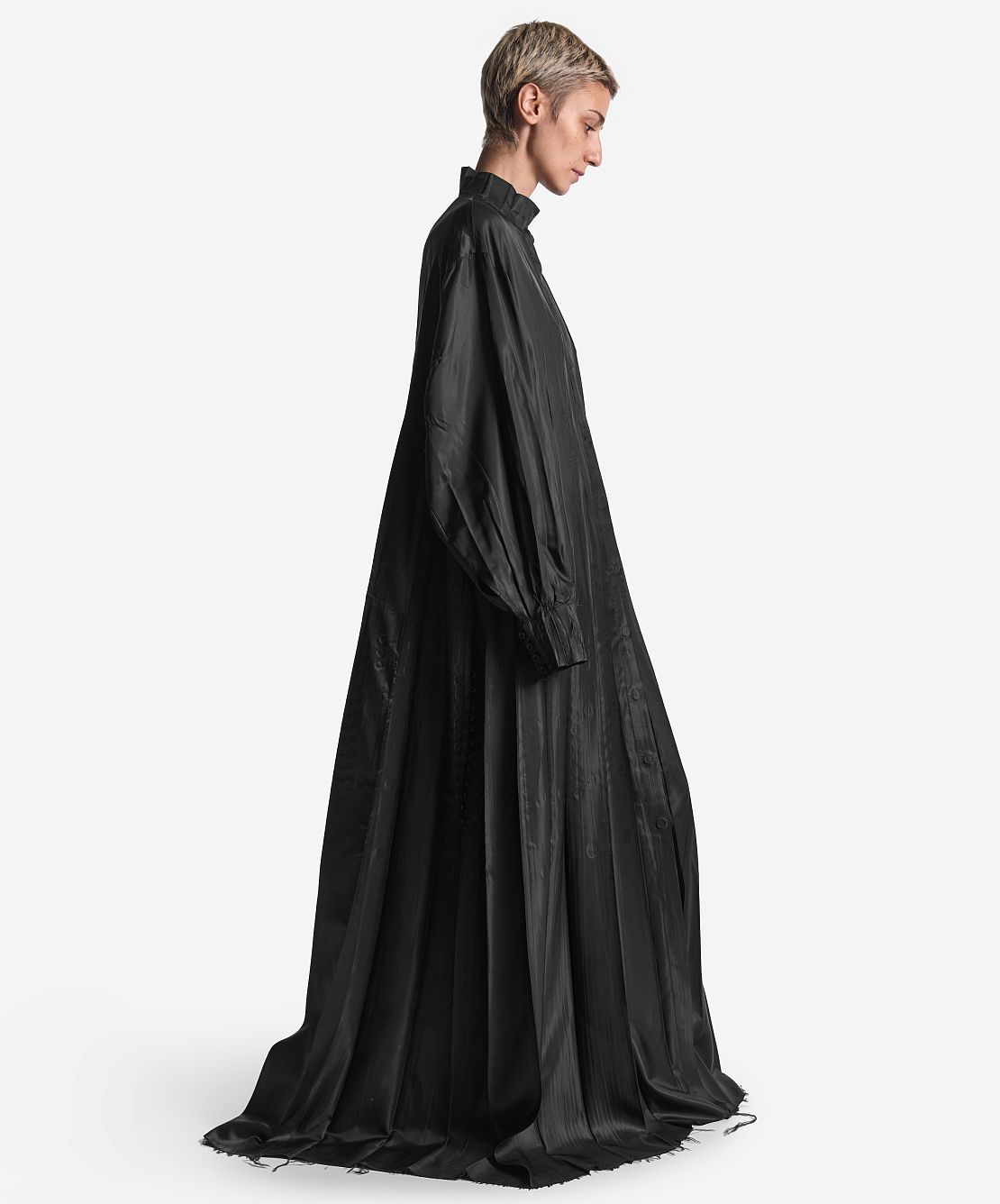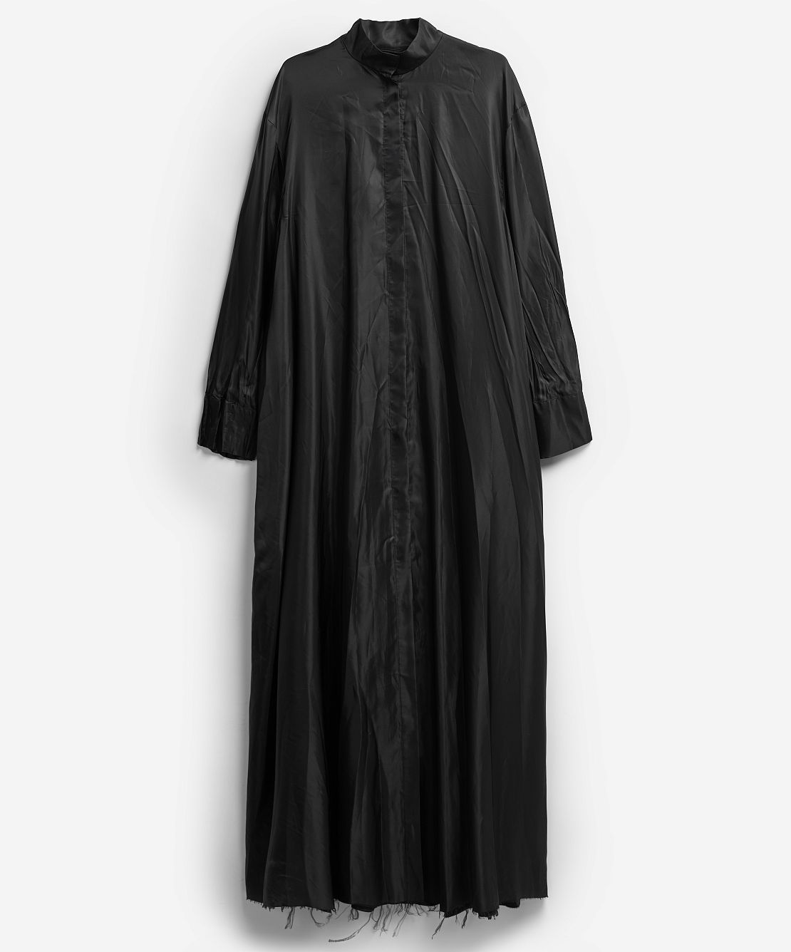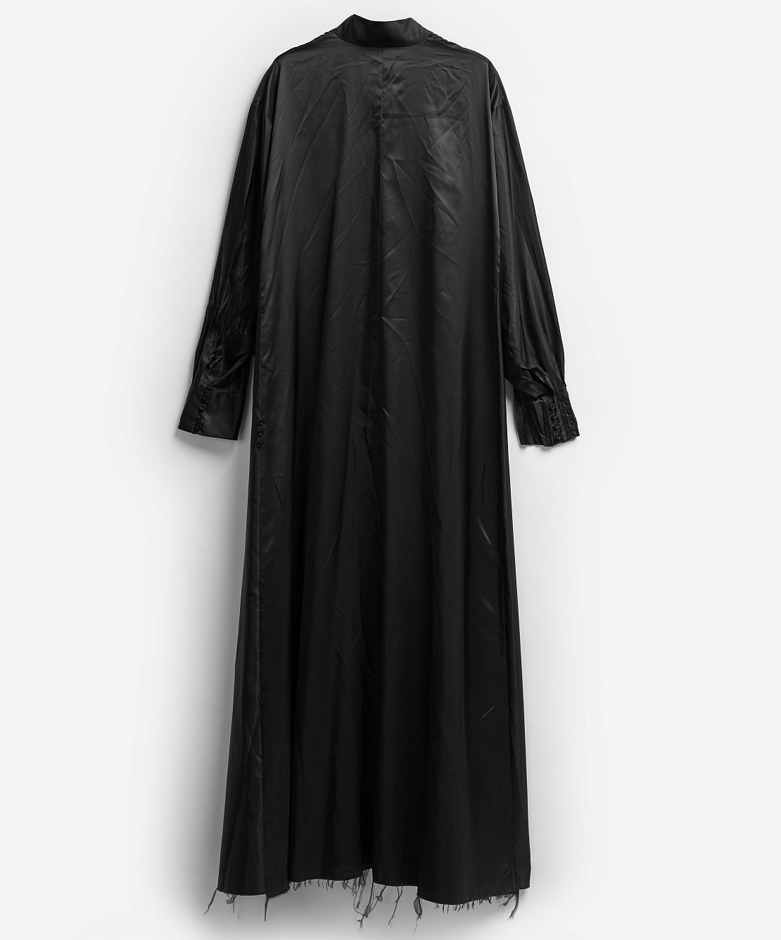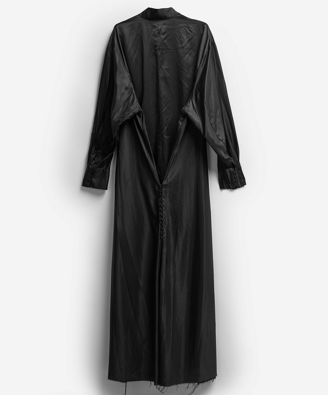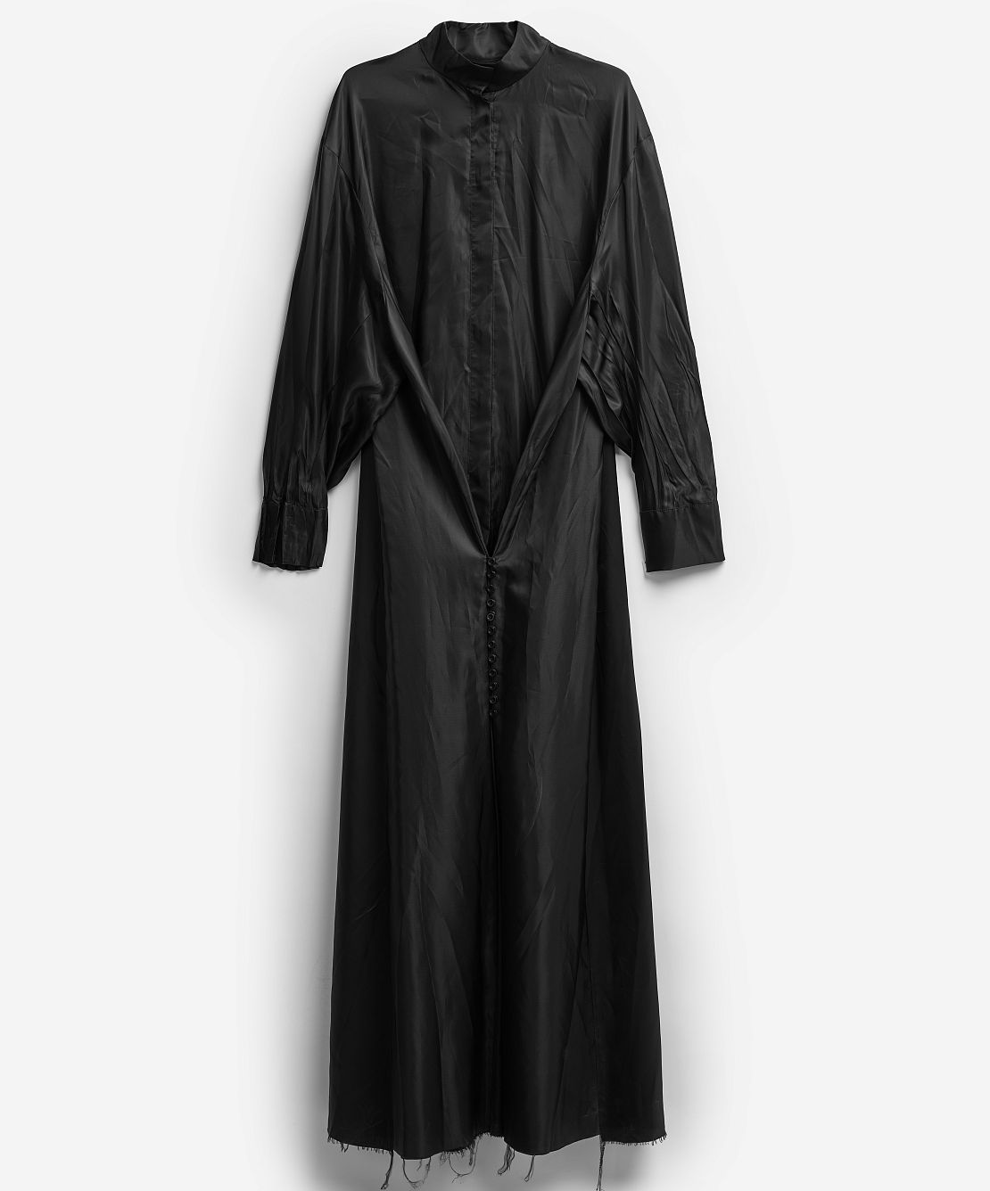 Внушительная часть коллекции I am that I am наполнена воспоминаниями креативного директора Ushatava Нино Шаматава о своих грузинских корнях, семье и гардеробе родителей. Один из результатов такого взгляда внутрь себя — платье «Грузинка». Это изделие наследует ключевые черты традиционного городского платья — приталенный силуэт, широкие и длинные рукава, воротник-стойку и длину в пол. Его черный цвет символизирует строгость и скромность грузинского народа. Для того чтобы снизить градус торжественности и сделать изделие более повседневным, мы использовали подкладочный материал в качестве основного и вручную придали ему жатый вид. Готовое изделие прошло испытание горячим прессом, в результате чего на ткани образовались неразглаживаемые отпечатки фурнитуры — пуговиц и петель.