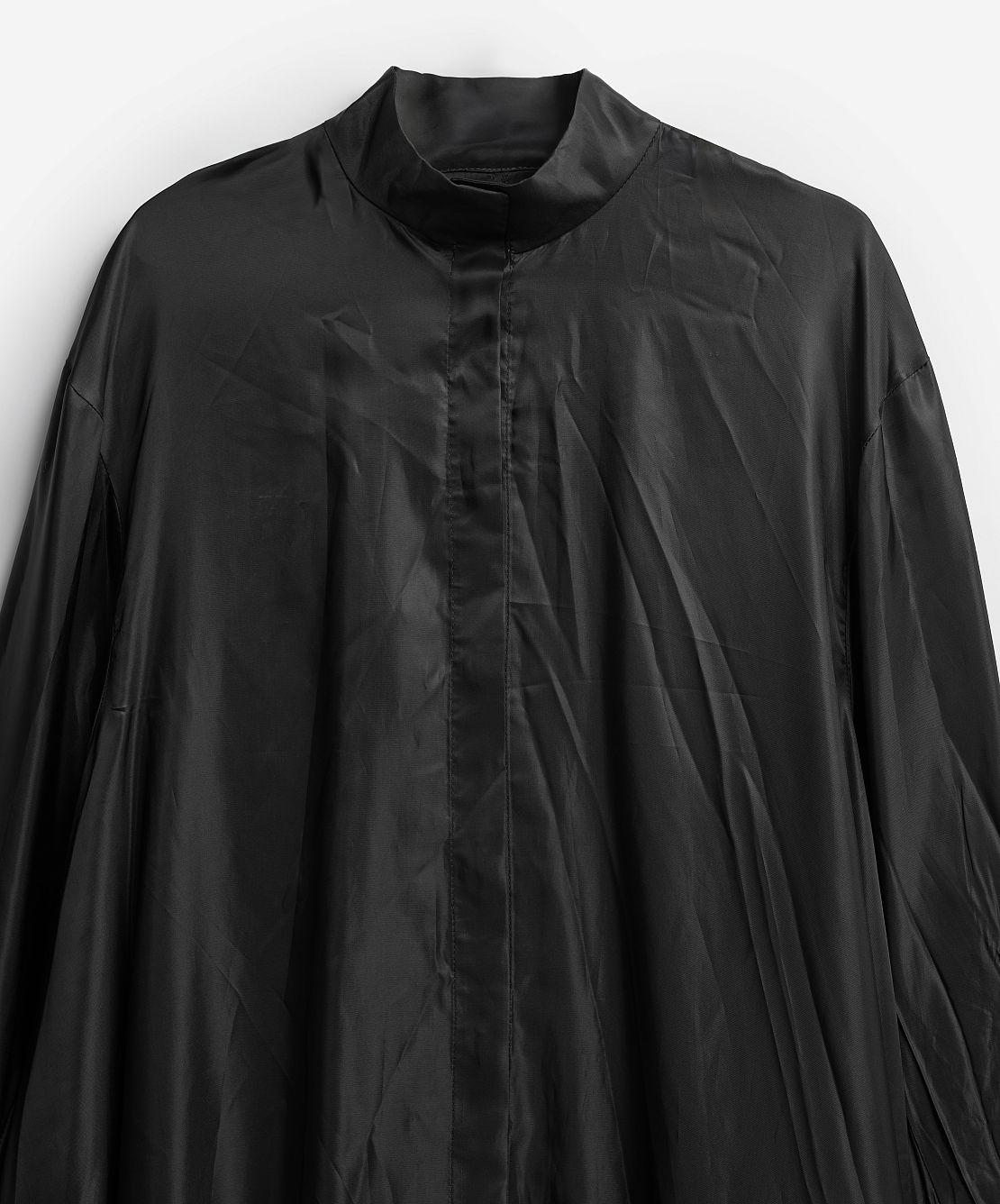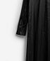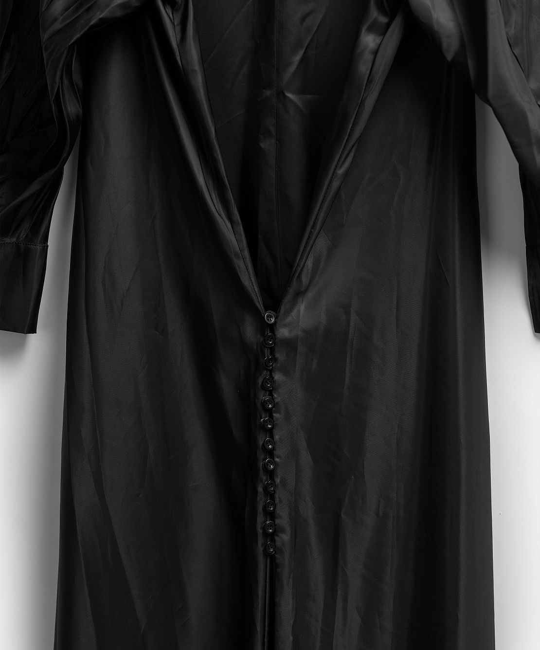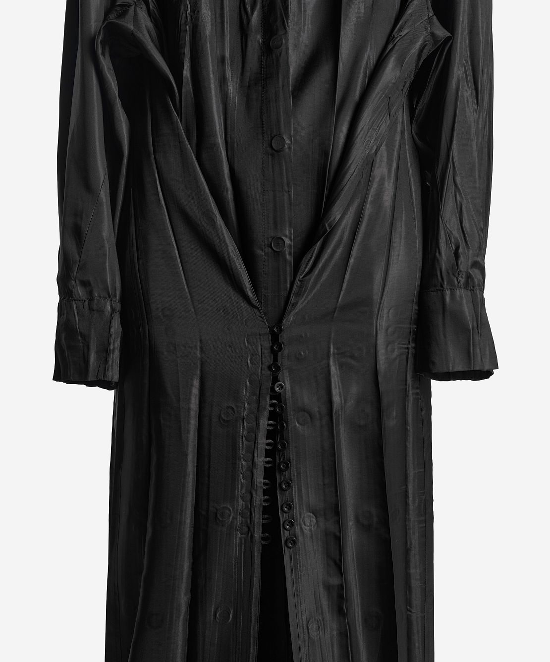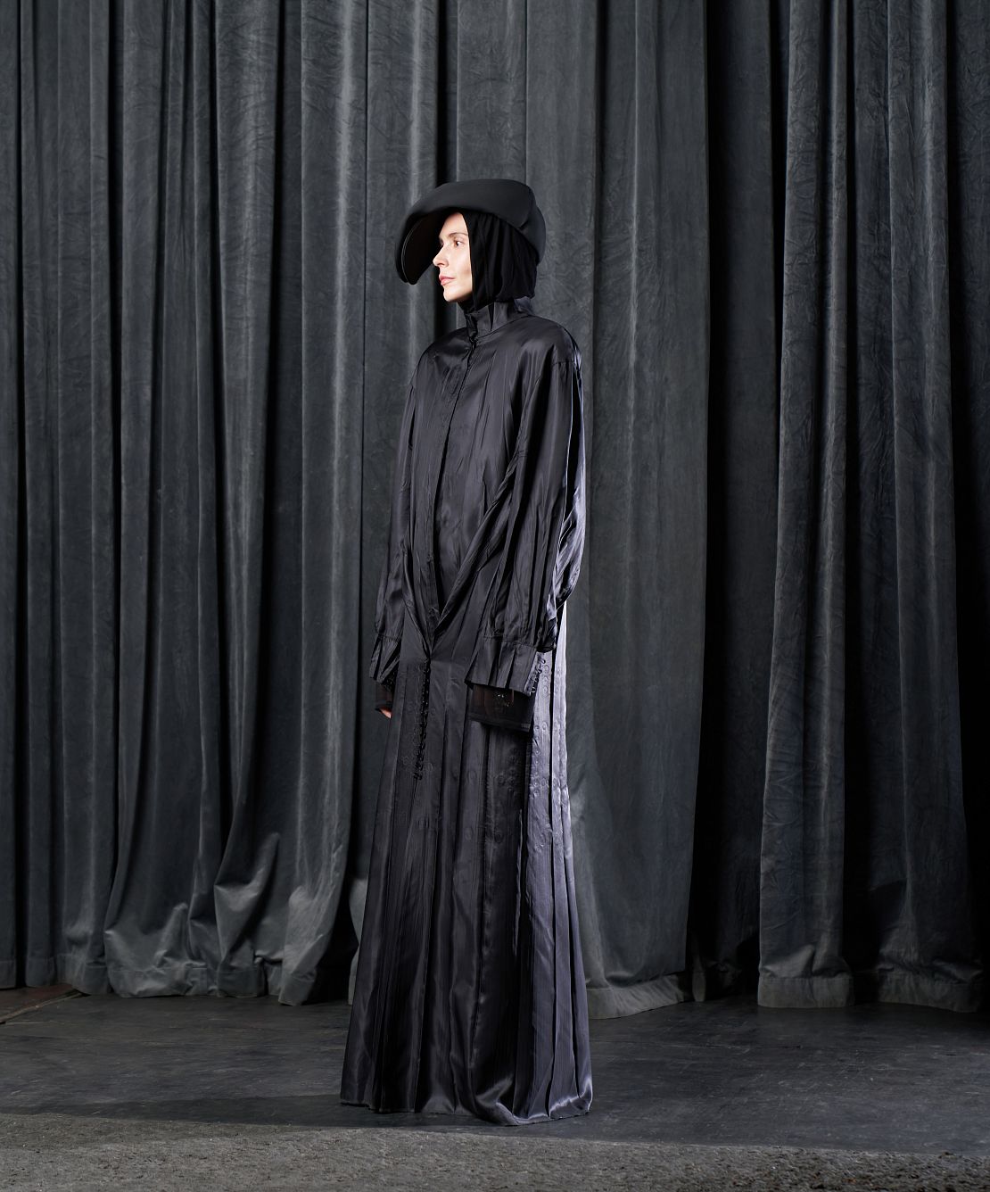 Внушительная часть коллекции I am that I am наполнена воспоминаниями креативного директора Ushatava Нино Шаматава о своих грузинских корнях, семье и гардеробе родителей. Один из результатов такого взгляда внутрь себя — платье «Грузинка». Это изделие наследует ключевые черты традиционного городского платья — приталенный силуэт, широкие и длинные рукава, воротник-стойку и длину в пол. Его черный цвет символизирует строгость и скромность грузинского народа. Для того чтобы снизить градус торжественности и сделать изделие более повседневным, мы использовали подкладочный материал в качестве основного и вручную придали ему жатый вид. Готовое изделие прошло испытание горячим прессом, в результате чего на ткани образовались неразглаживаемые отпечатки фурнитуры — пуговиц и петель.
