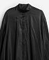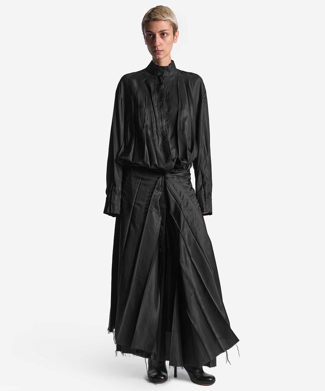 Платье стало воплощением одной из любимых тем Ushatava — вещей-трансформеров. По боковому шву юбки расположен ряд пуговиц — продевая их через воздушные петли на противоположной стороне изделия, можно менять облик вещи на теле. Длинный подол, присборенный сзади, образует «хвост», а при фиксации ткани спереди возникнет аккуратный напуск.