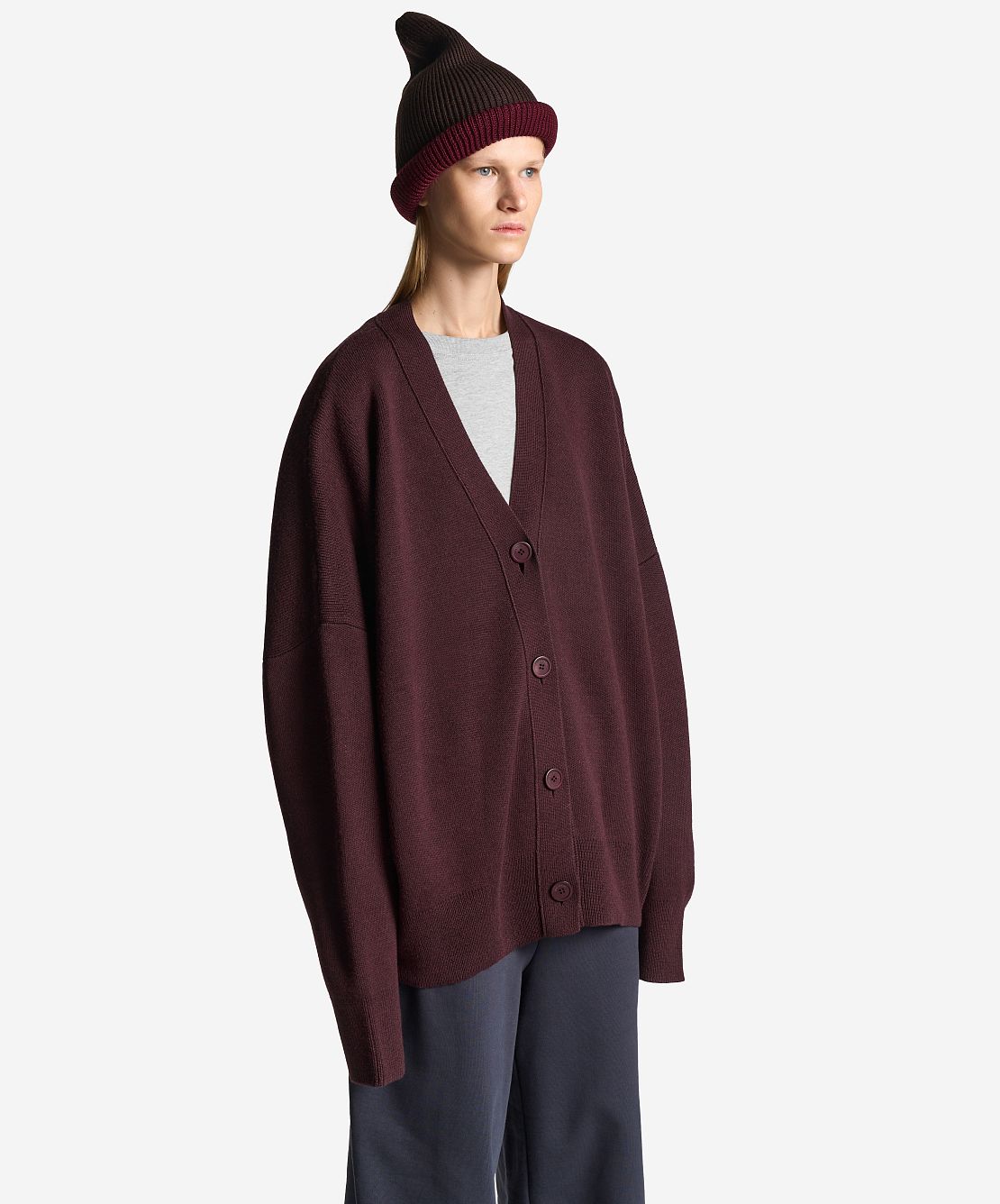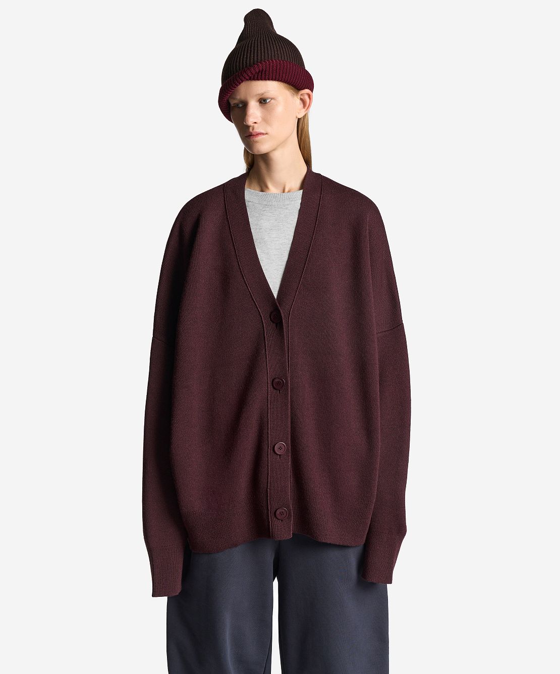 Вязаный кардиган удлиненного оверсайз-силуэта. Одинаково хорошо сидит на мужской и женской фигуре. Застегивается на роговые брендированные пуговицы. Благодаря наличию в составе акрила кардиган не пиллингуется и не деформируется со временем.